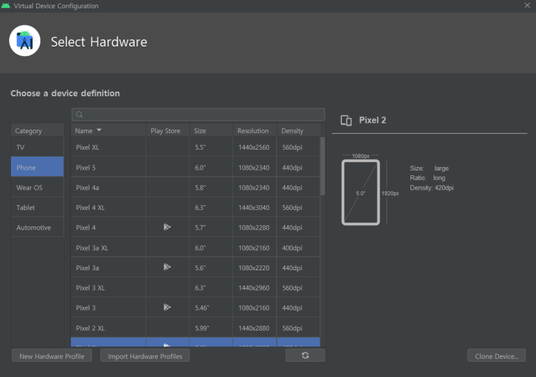 Android Emulator에서 시뮬레이션하려는 Android 스마트폰,